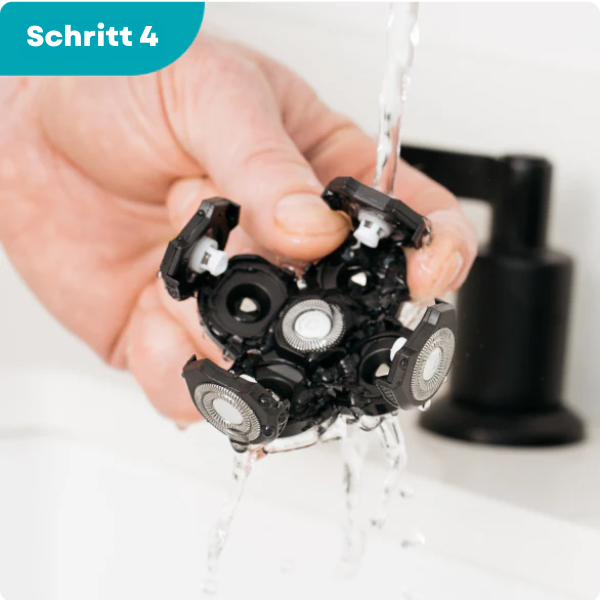 Öffne die Klingen und spüle sie unter fließendem Wasser aus, um Haare und Rückstände zu entfernen.