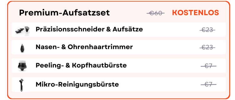 Ausgestattet mit einem Haarschneider und Aufsätzen, einem Nasen- und Ohrenhaartrimmer, einer Peeling-Bürste und einem Kopfhaut-Schrubber